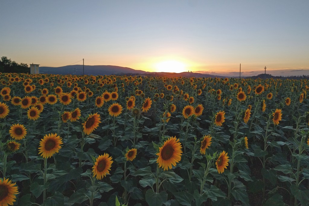 Teel ööbimiskohta, Relax Hotel Aquaviva, sattusime me imelisele päevalillepõllule San Gimignano silueti taustal, kust avanes kaunis vaade päikeseloojangule.
