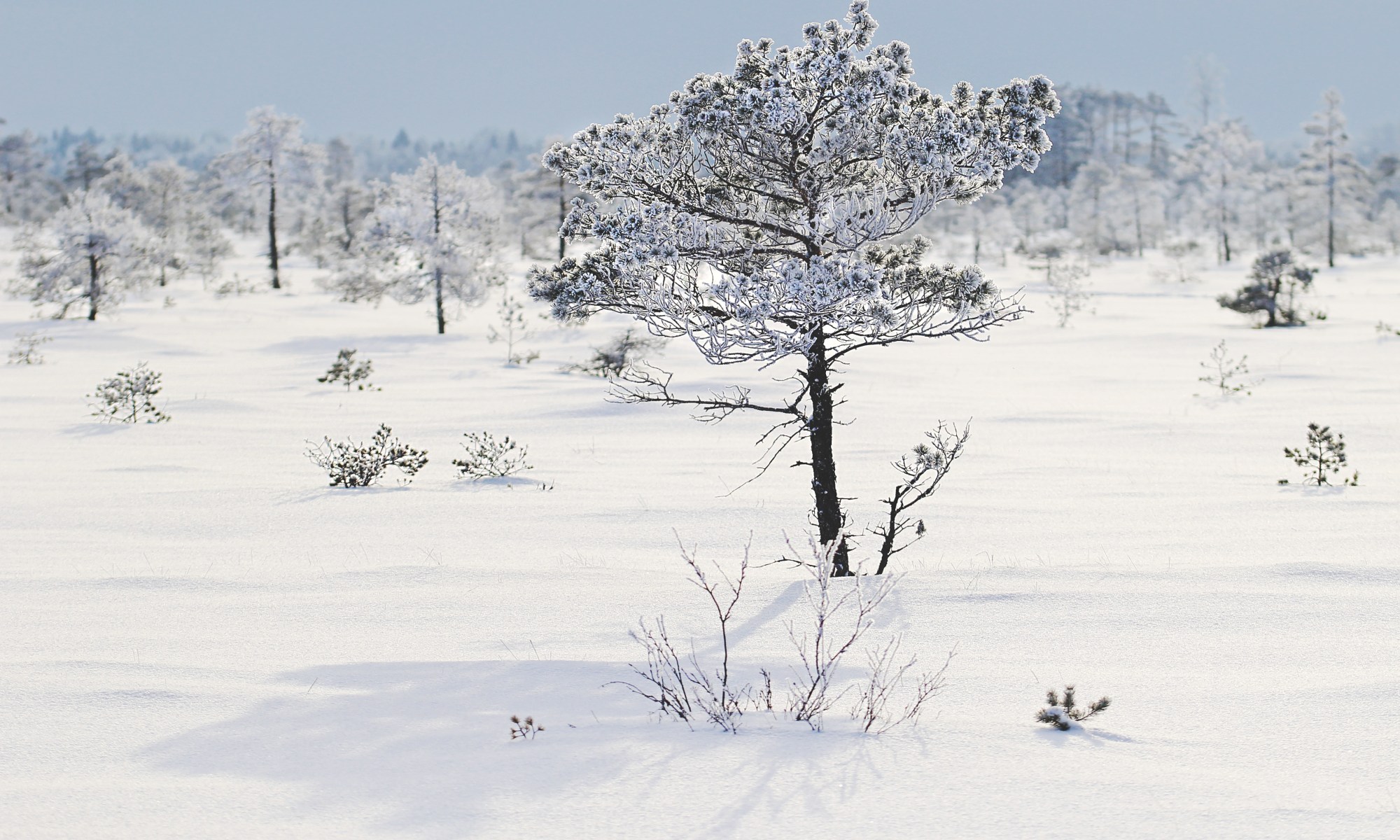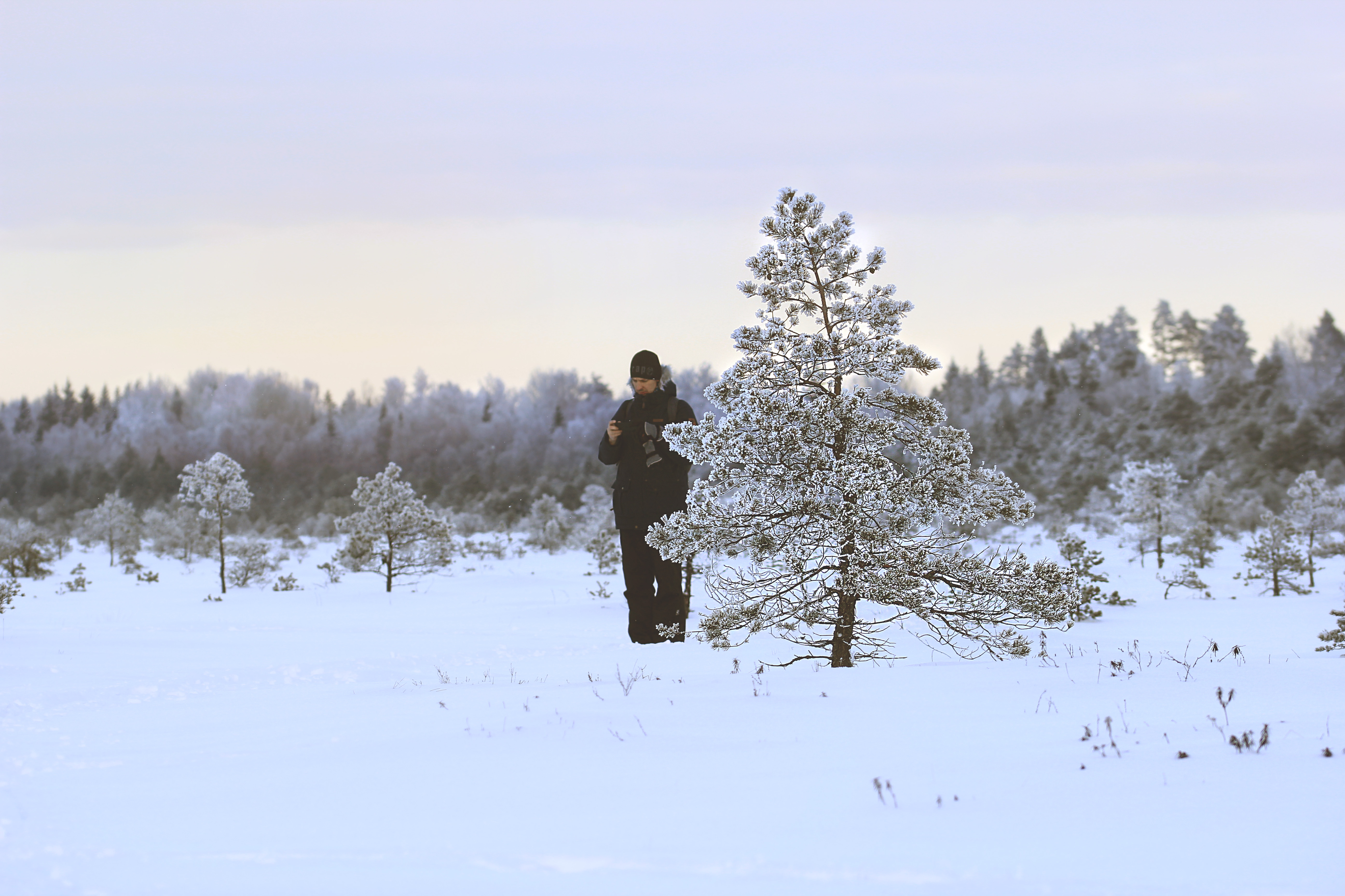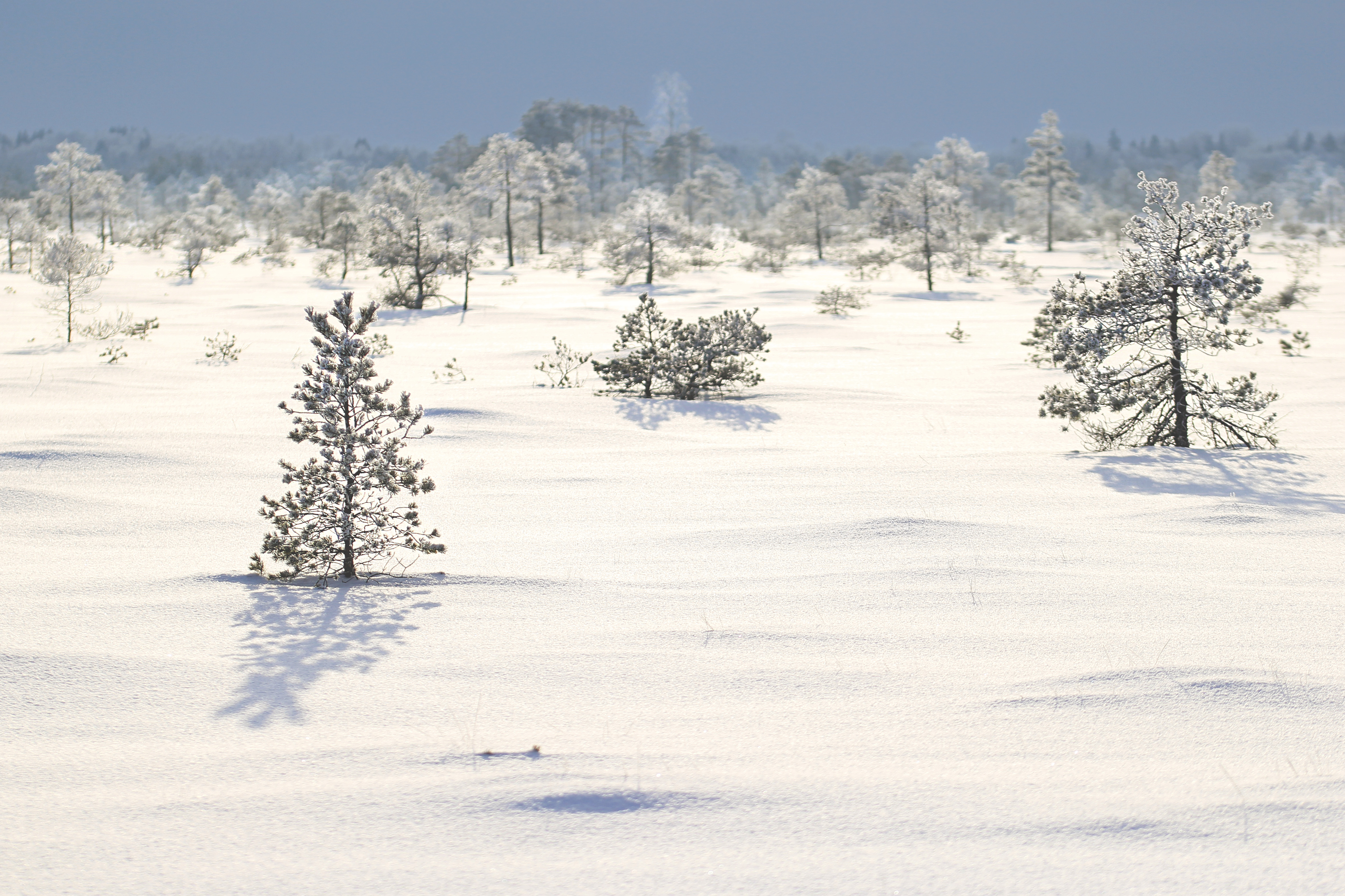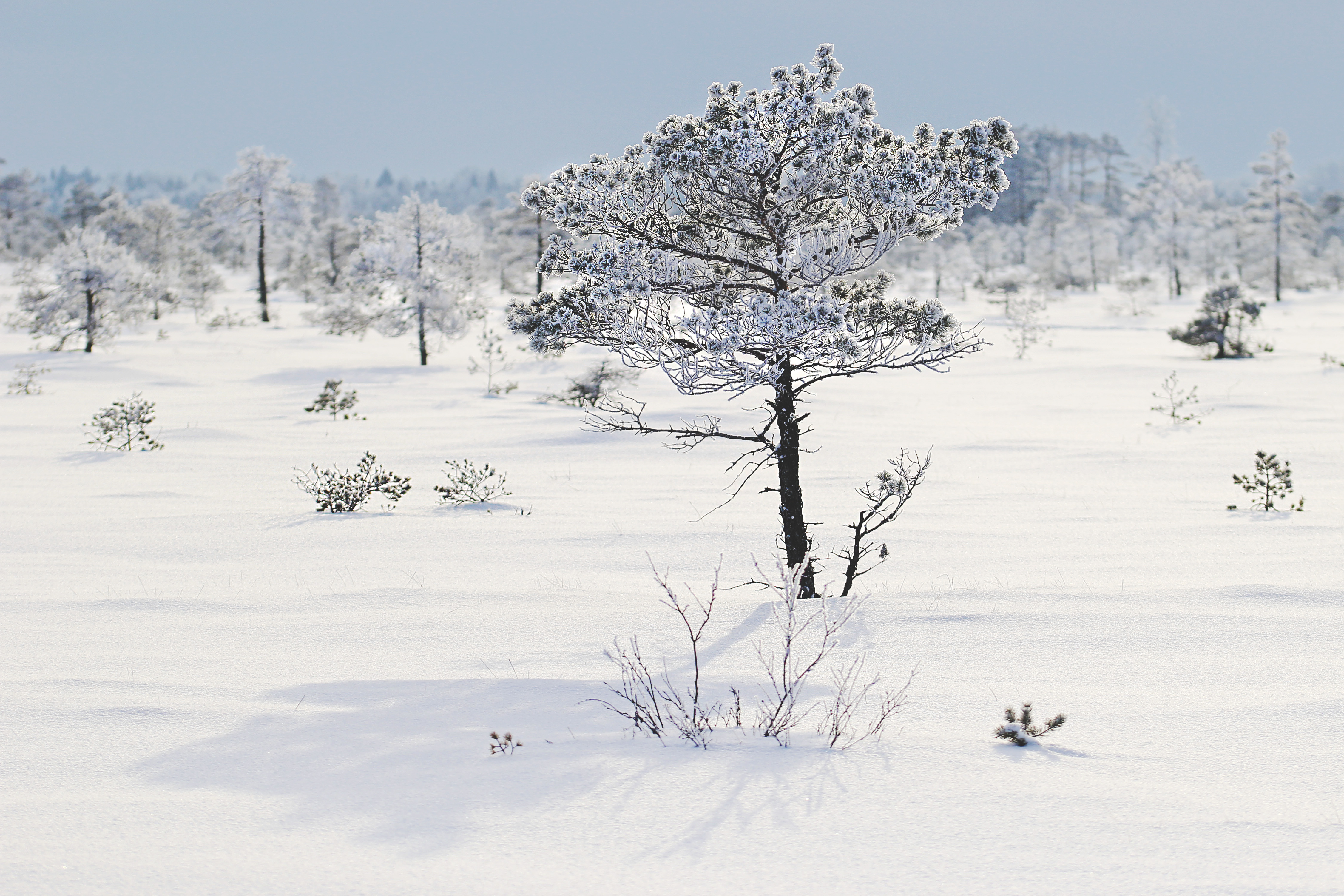 Kogu autosõidu vältel säras malbe talvepäike taevas, kuid see karma, mis meid viimasel ajal on saatnud, ilmutas end paraku ka sel korral – raba kohal laiusid tumesinised lumepilved ning 5 minutit pärast metsatuka vahelt rabamändide vahele jõudmist kadus päike selleks päevaks pilvede varju peitu. Siiski, kõik need viis minutit nautisime seda kaunist lumevarjude mängu, mida ka paarile fotole suutsin jäädvustada.