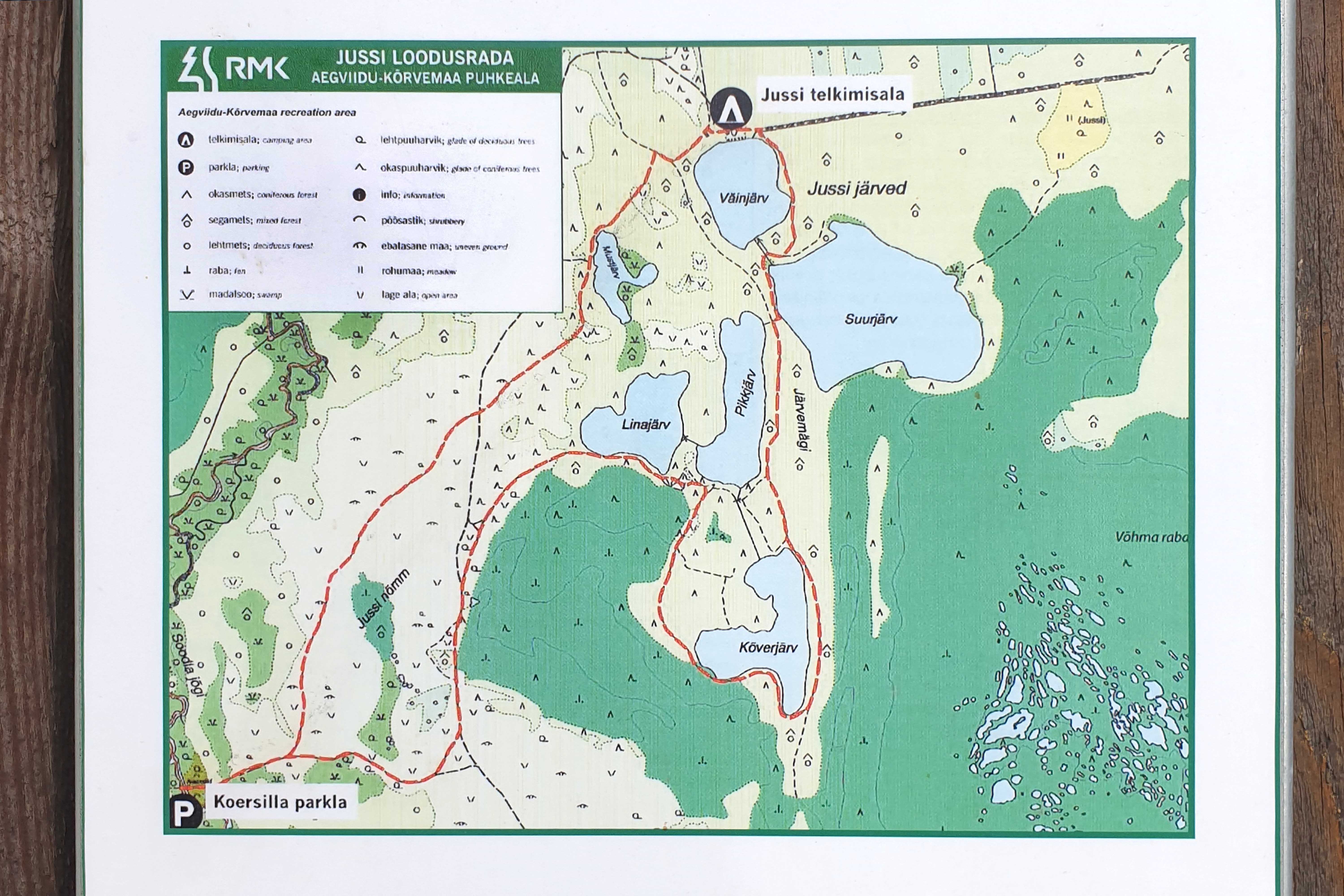 Lisan ka rajaskeemi, mis on loomulikult olemas ka Jussi raja alguspunktis autoparklas. Raja pikkuseks kirjutab RMK küll 8,8 kilomeetrit, kuid terve kaardil märgitud raja läbimiseks tuleb arvestada umbes 11 kilomeetriga. Raja alguspunkti leiad Google Mapsist SIIT.