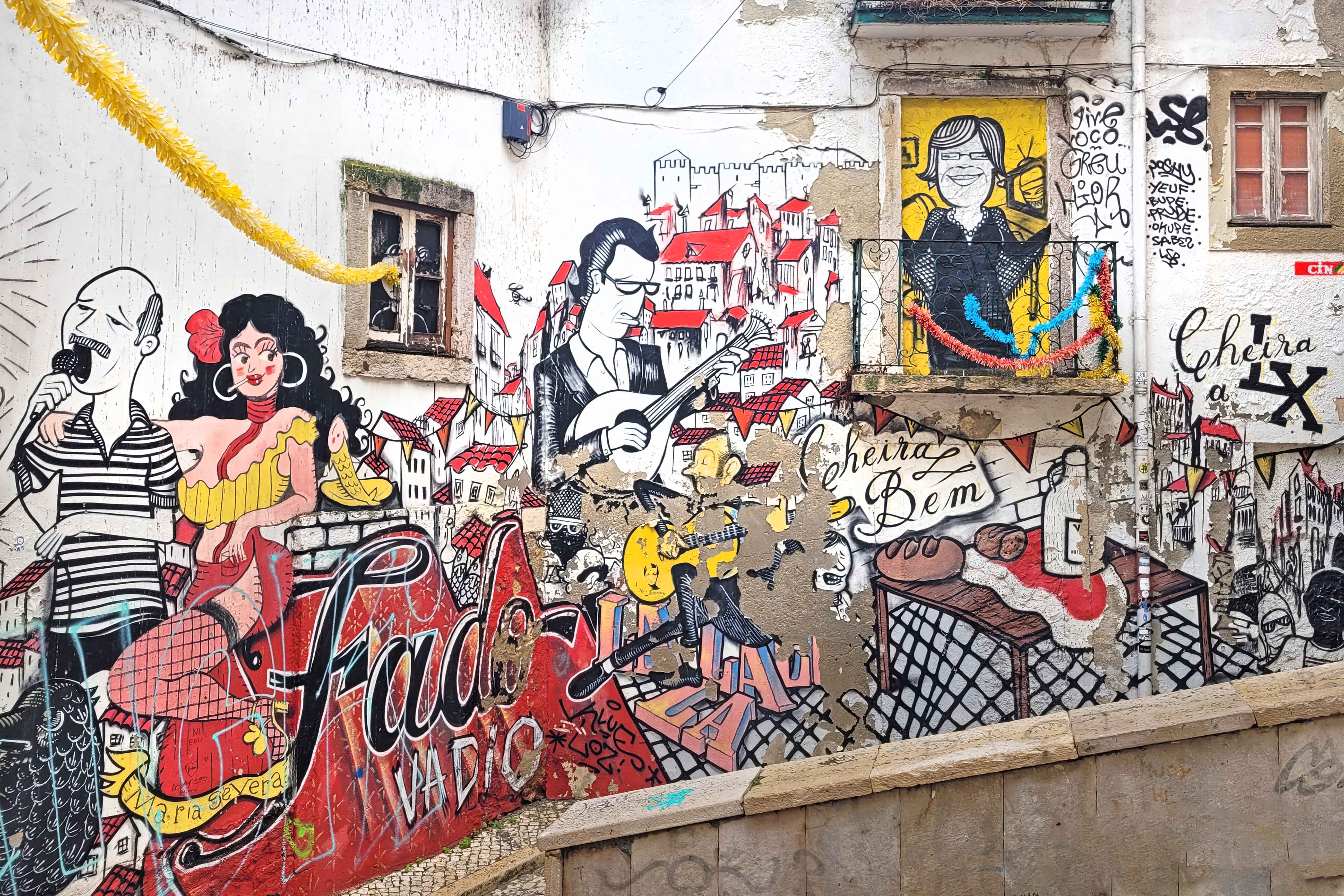 Valisime esimeseks sihtmärgiks kohe Lissaboni populaarseima vaatamisväärsuse – São Jorge kindluse, kuid teel sinna leidis üks populaarne paik ise meid üles. Keerasime suvalisse kõrvaltänavasse ning avastasime end järsku ühe väikese turismigrupi keskelt. Pöörasime siis silmad majafassaadidele, ning märkasime kõikjal lahedat tänavakunsti. See koht São Cristóvão treppide juures oli Fado Vadio – Lissaboni kuulsaim graffiti, ausutusavaldus Portugali rahvalikule muusikastiilile (fadole) – mis sai teoks täna naabruses elavatele inimestele, kes jõud ühendasid ja üritasid koos andekate kunstnikega naabruskonda kaunimaks muuta.