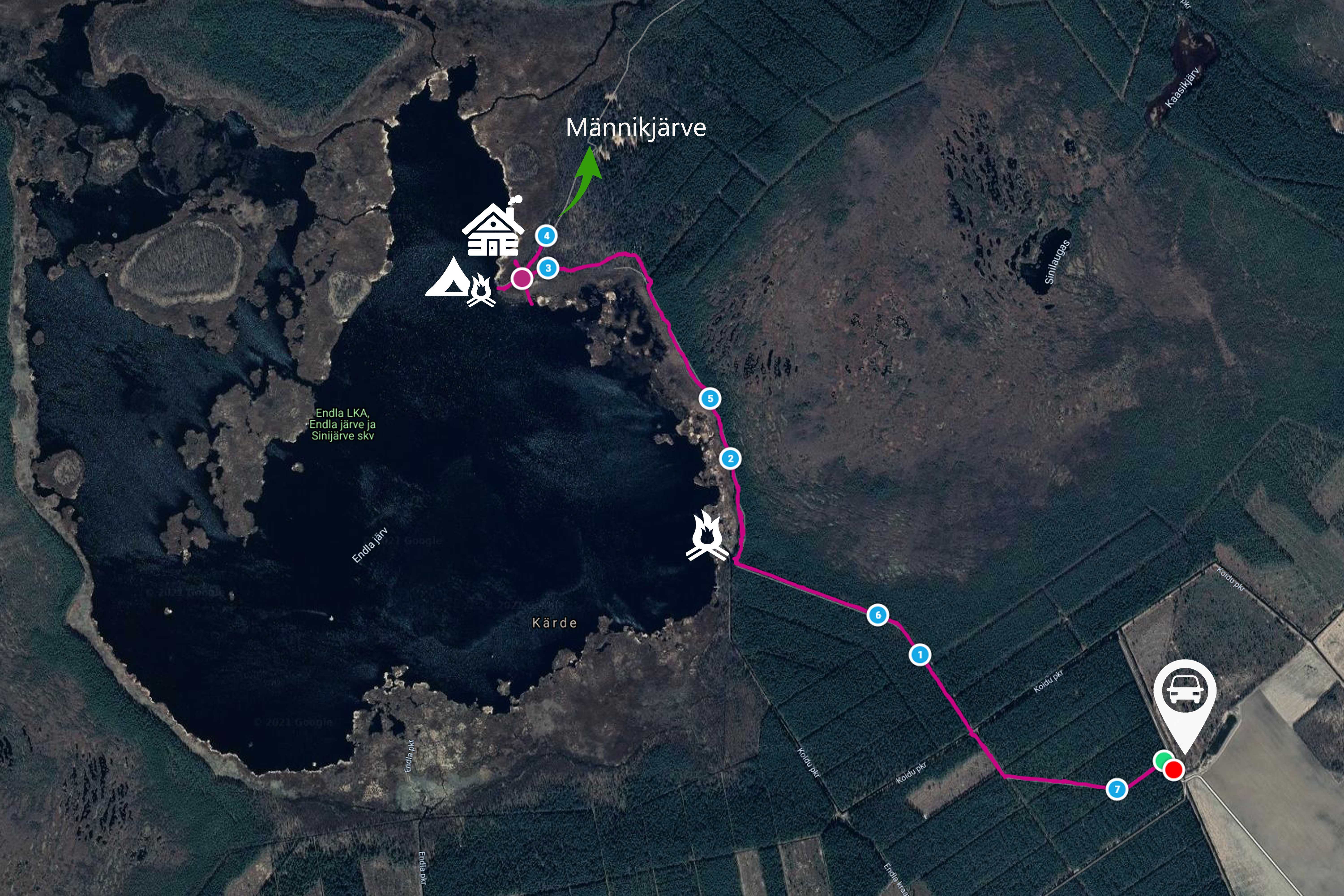 Edasi kulgeb rada mööda männimetsa serva, vasakul üle väikse võsa ja kõrkjate paistmas Endla järv. Kohas kus rada läheb edasi Männikjärve raja poole, on ka tee ääres märgistus olemas, aga kui on soov minna uudistama metsamajakest, siis hoidke vastava noole suunas.