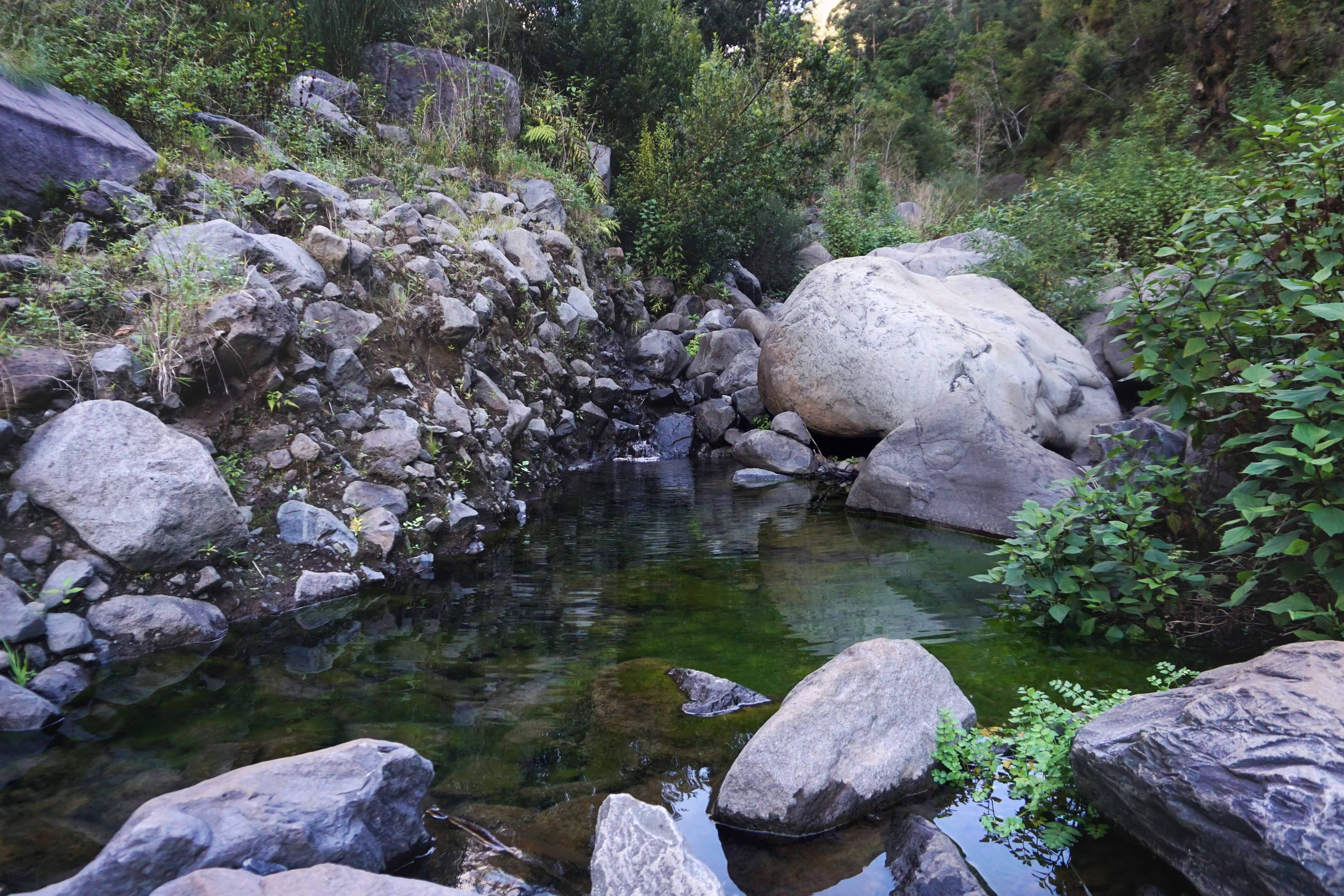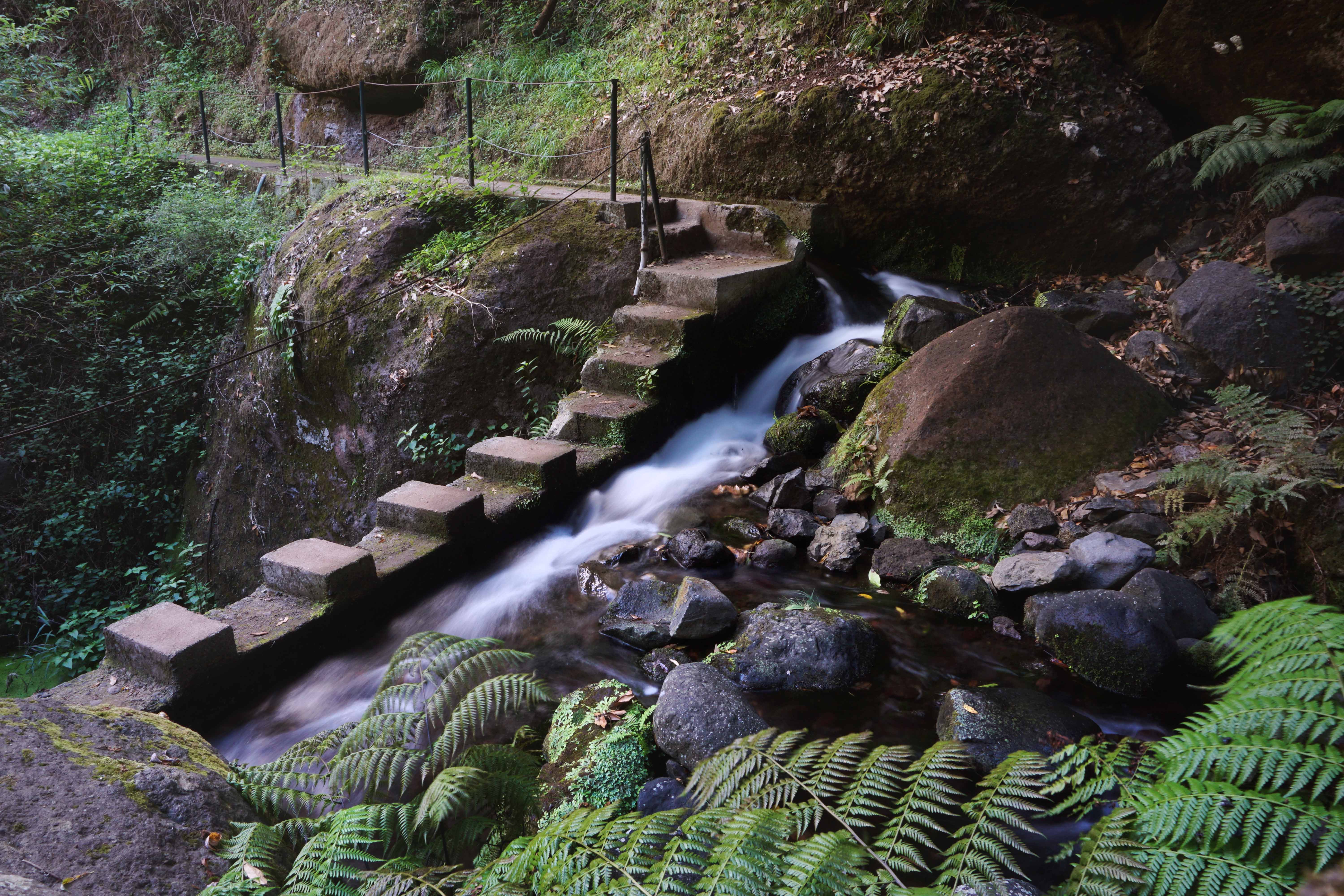 Ühel hetkel märkate paremal käel olevat treppi (trepp on ka märgitud WalkMe äpp-i kaardile, kahjuks ei teinud sellest ühtegi pilti) ning see on koht, kus saab turvalisemalt Levada Novale üle minna. Meie muidugi põikasime mööda kive üle jõe ning liikusime mööda kivipurust teed edasi koseni, kus olid ka mitmed puhkekohad.