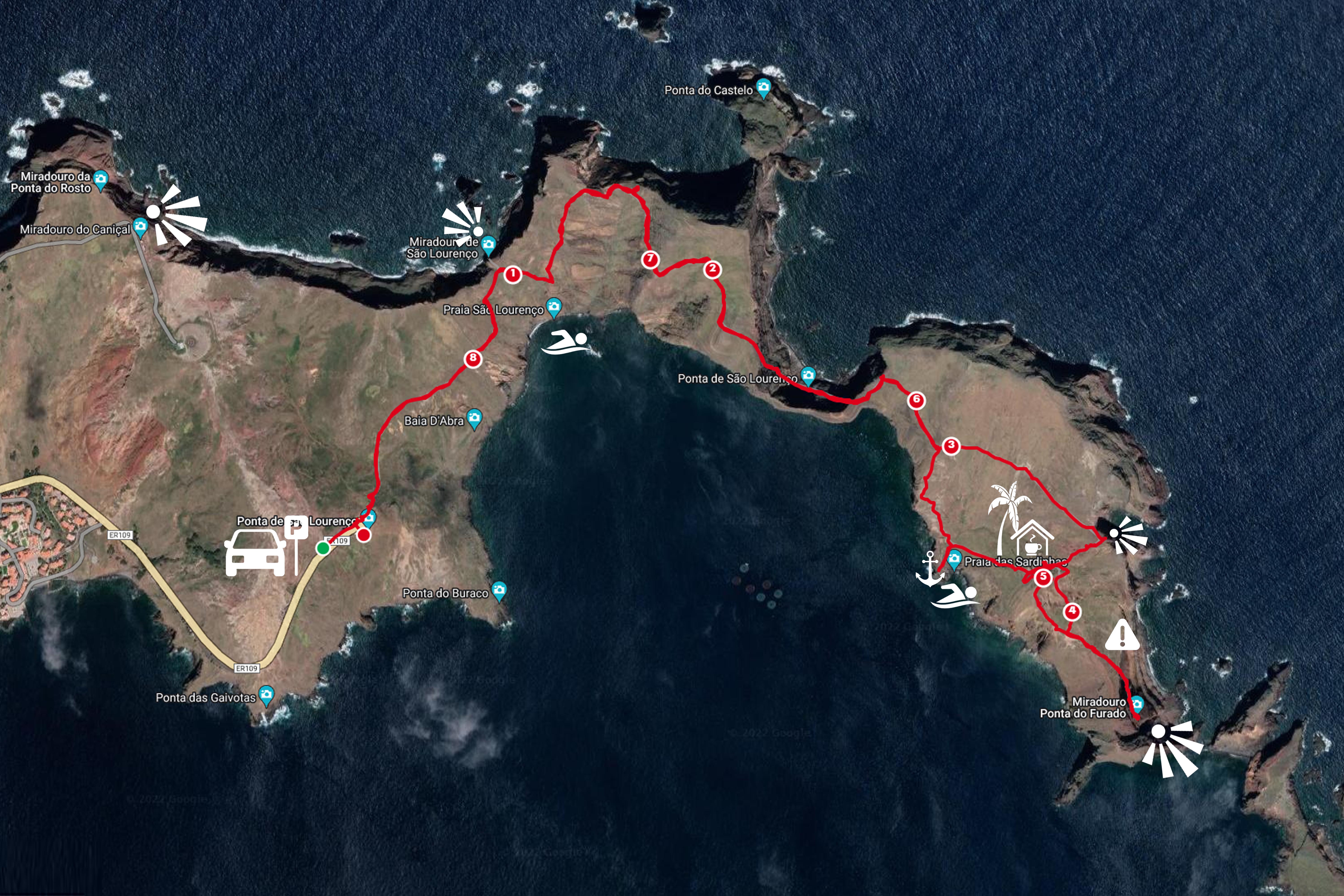 Madeira idatipus, São Lourenço poolsaarel, kulgeb üks unikaalne maastikurada – PR8 Verada da Ponta de São Lourenço, kuhu läksime me juba hommikul varavalges. Enne rajale suundumist tegime kõrvalepõike Miradouro da Ponta do Rosto juurde , kus pildistasime päeva esimesi päikesekiiri, vaated poolsaarele olid sealt väga võimsad.